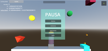 Hasta ahora he construido unas escenas básicas que incluye una nave, una plataforma de aterrizaje y varios obstáculos geométricos. También he implementado efectos de partículas y un sistema de colisiones, aunque todavía estoy corrigiendo algunos errores en los scripts.